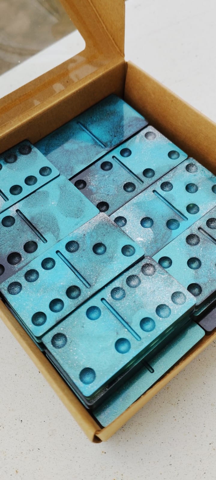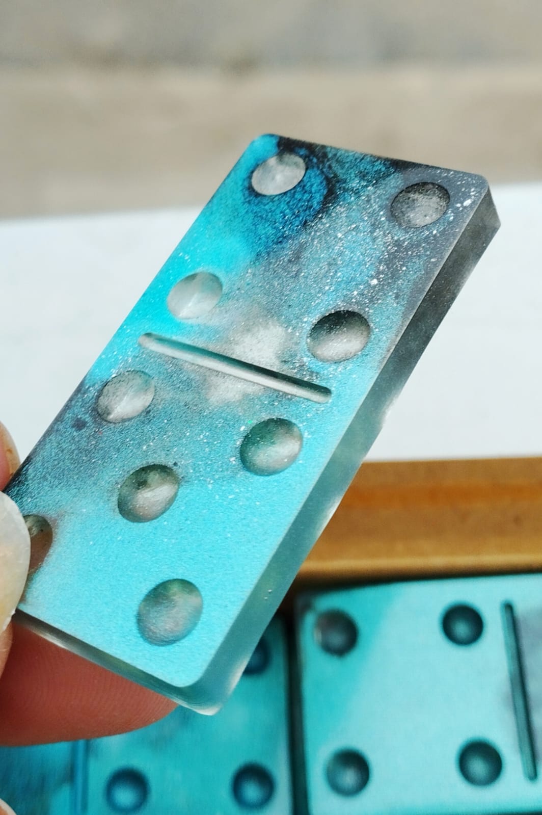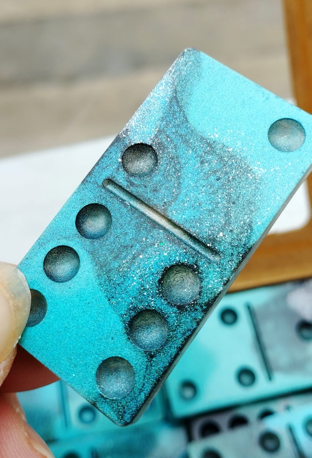 Domino z epoxidové pryskyřice s designem perleťových barviv černá/zelená a stříbrný prach.