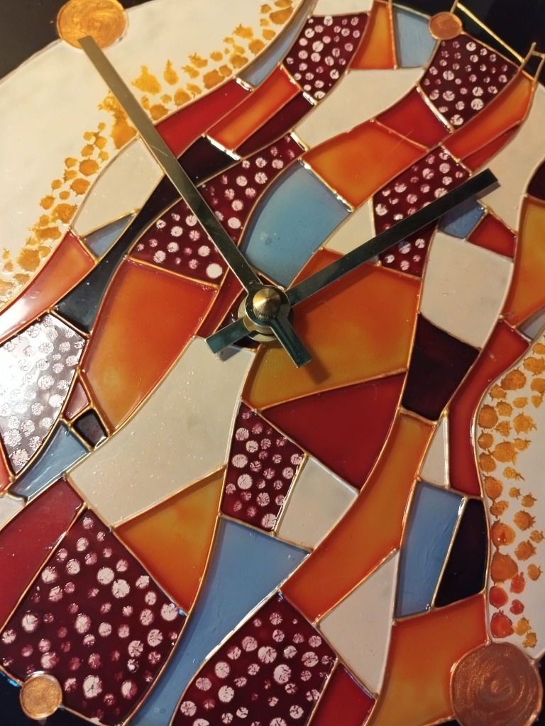 Hluboké odstíny vínové a černé ostře kontrastují s plochami krémové, oranžové a blankytně modré. Celá kompozice je protkána zlatou reliéfní konturou, která se na světle jemně třpytí a dává hodinám drahocenný vzhled. Díky detailnímu tečkování a struktuře barev působí motiv velmi plasticky.
