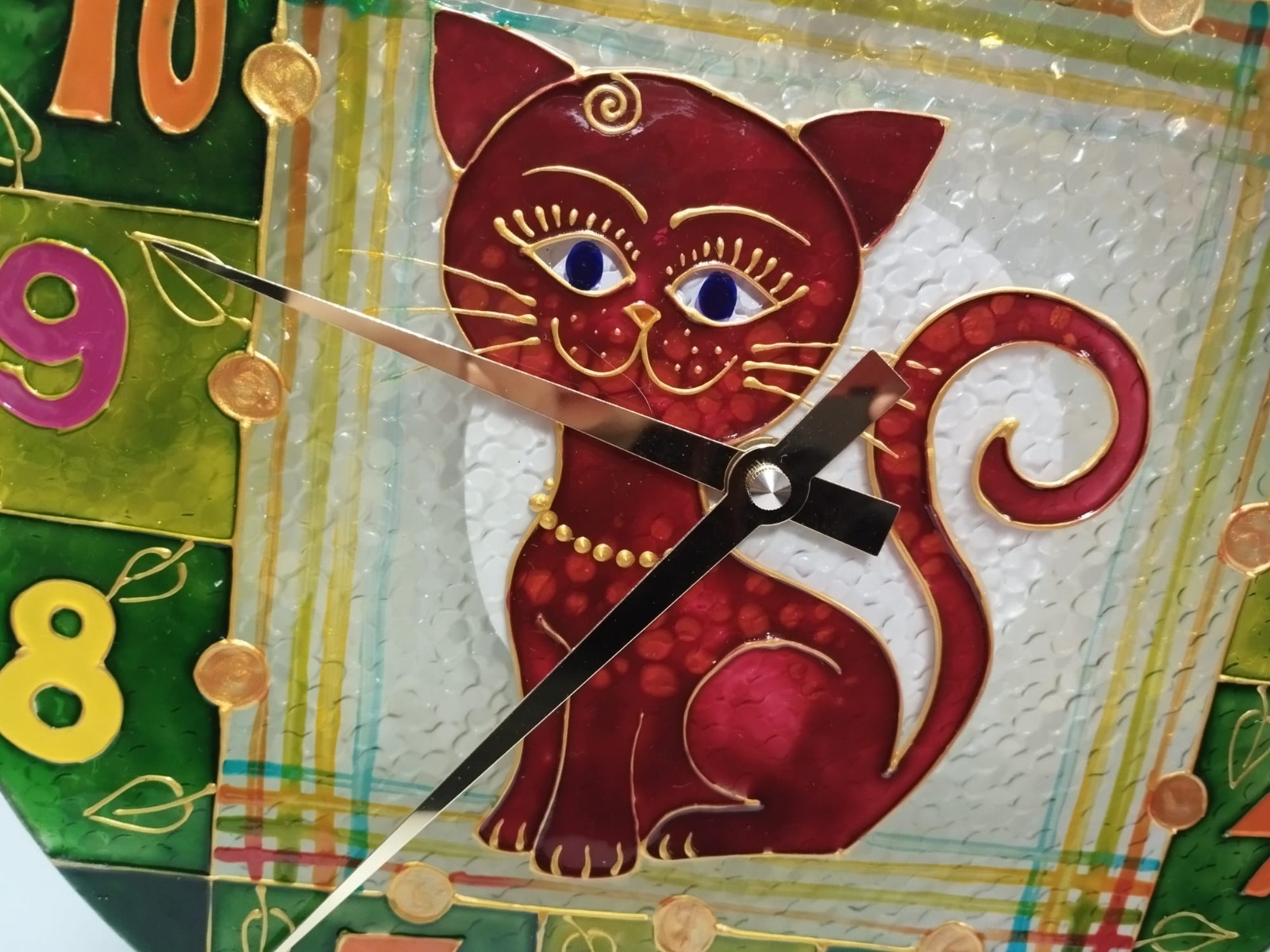 Pozvěte si domů tuhle elegantní společnici, která nikdy nezmešká čas krmení! Tyto ručně malované skleněné hodiny o průměru 25 cm zdobí motiv stylizované kočky v bohatých vínových tónech. Ciferník je lemován pestrobarevnými číslicemi v zelených a žlutých polích, které připomínají hřejivou kostkovanou deku. Zlaté detaily a lístečky dodávají hodinám pohádkový nádech.