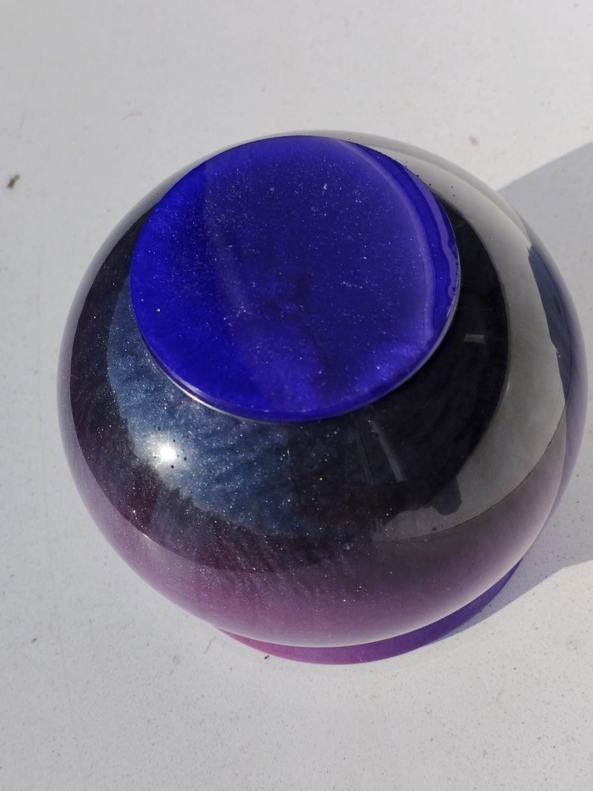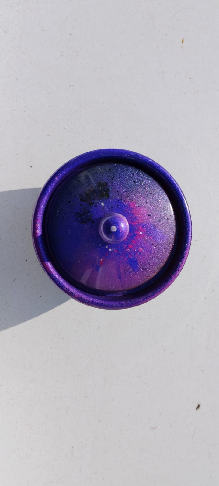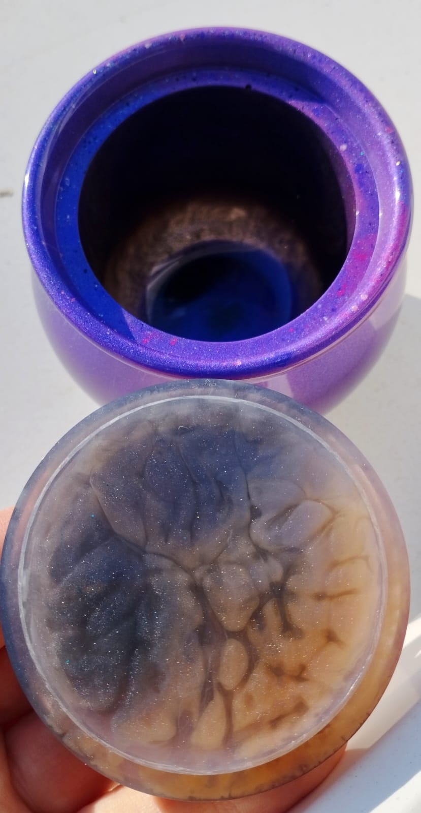 Krásná originální dóza s víkem z epoxidové pryskyřice s designem perleťových barviv. Kombinace fialové, růžové a černé. Průměr hrdla s okrajem 8cm, výška 8 cm. Vhodná třeba na medík či cukřík, nebo může sloužit i na svíčku či jako úložiště na šperky.