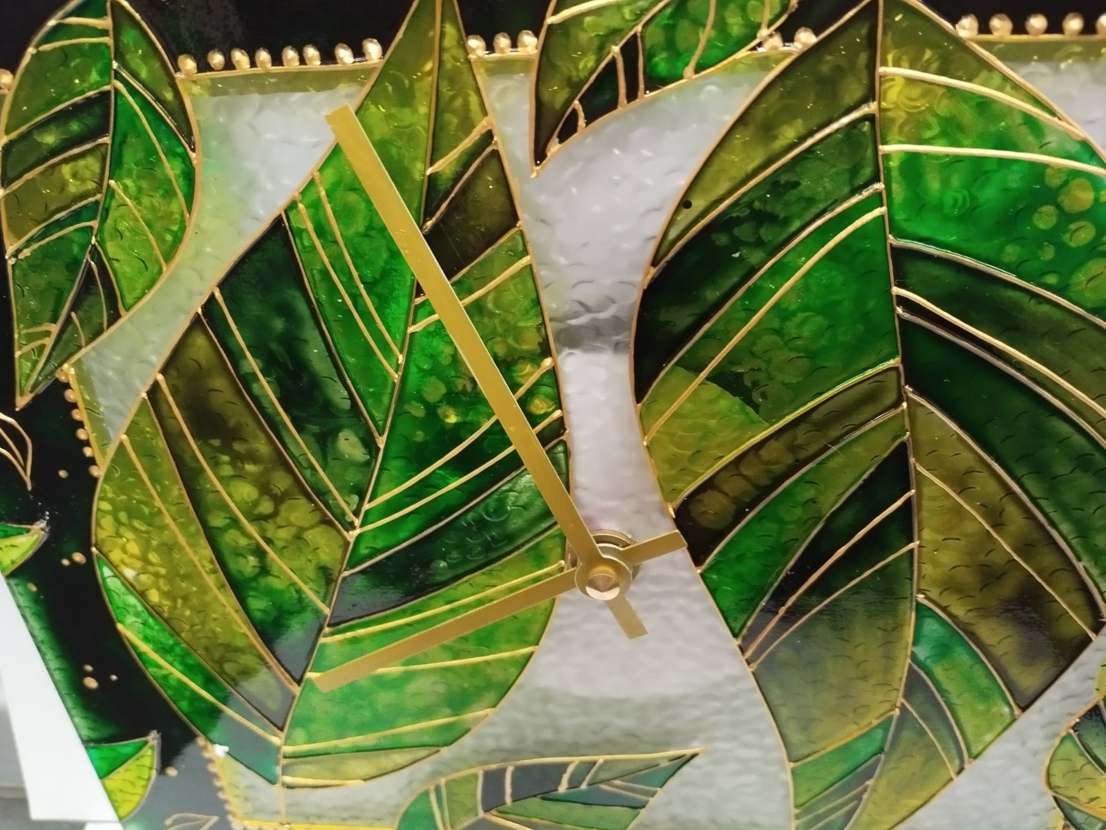 Vneste do svého domova kousek věčně zelené přírody. Tyto ručně malované skleněné hodiny o rozměru 25 x 25 cm zachycují krásu listoví v detailním provedení. Centrální motiv tvoří dva velké, výrazně žilkované listy, které doplňuje tanec menších lístků na hlubokém tmavém pozadí. Zlaté tečkování a linky dodávají celku luxusní vzhled a připomínají ranní rosu třpytící se v slunci.