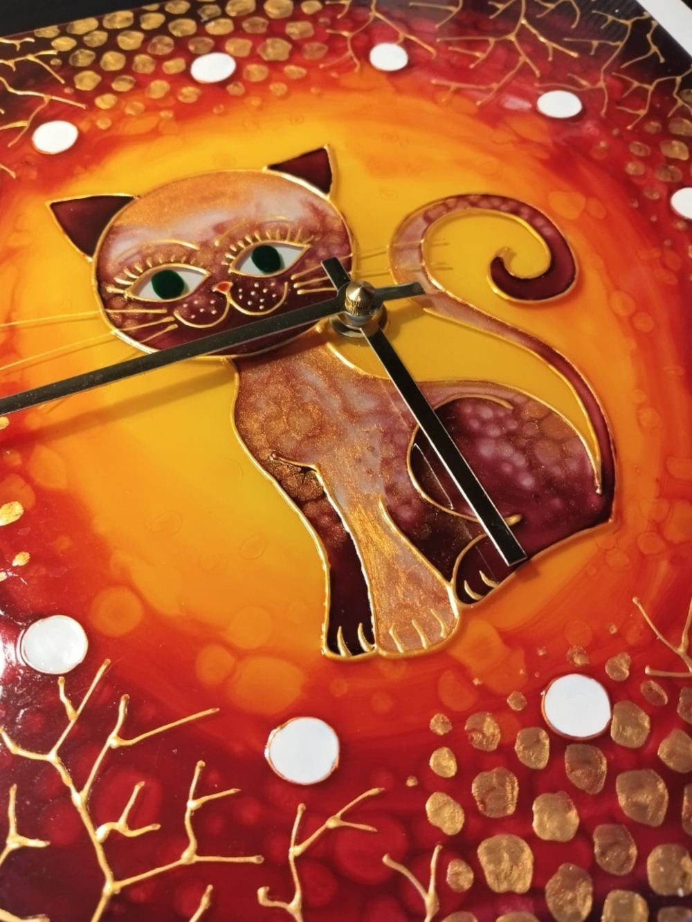 Každé hodiny jsou autorským originálem. Motiv je malován pečlivě konturovou technikou na skle, což vytváří jemný reliéf a krásnou hru barev. Kombinace ohnivě oranžové, červené a zlatých detailů dodává hodinám luxusní a hřejivý vzhled.