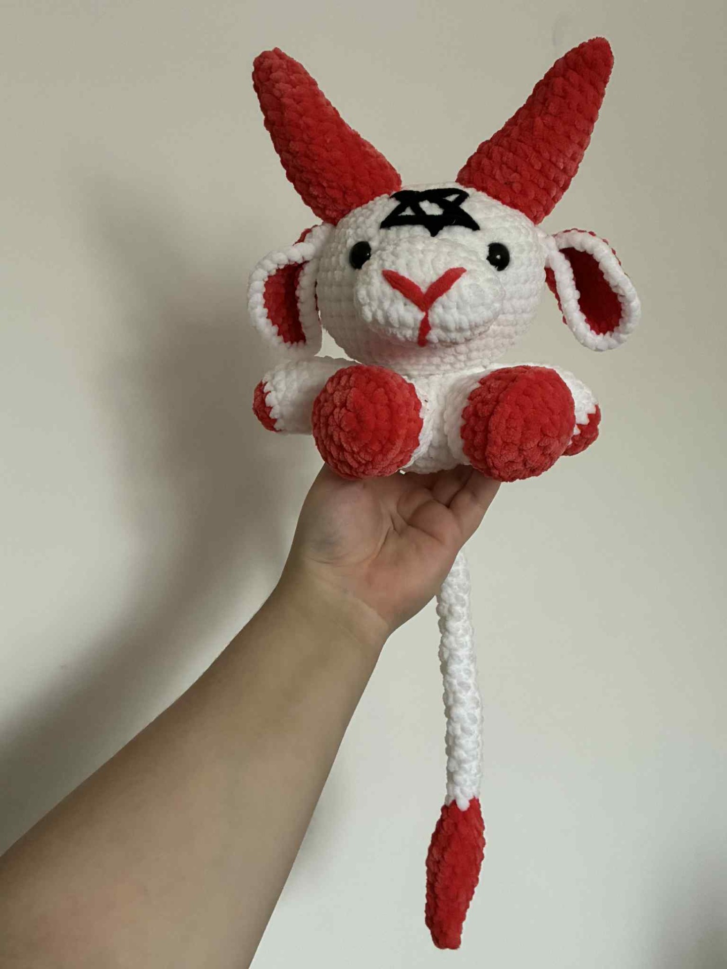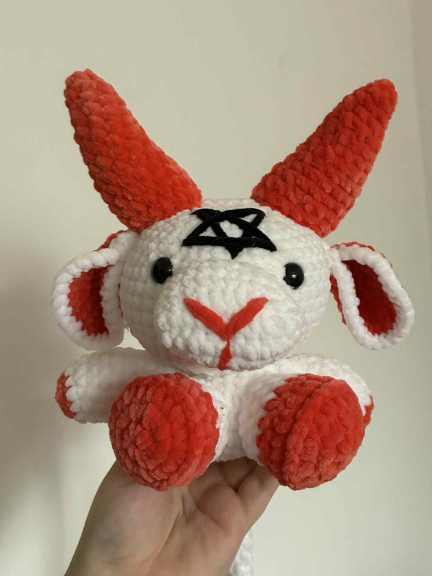 Originální, ručně háčkovaný Baphomet je ideálním doplňkem do každého interiéru. Tento jedinečný kousek je vyroben z hebké žinylkové příze, díky které je neuvěřitelně příjemný na dotek.