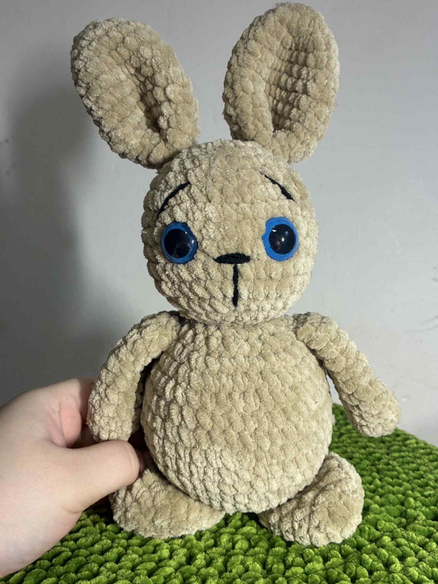 Béžový králíčekRučně háčkovaný králíček z hebké žinylkové příze.. Má roztomilý kukuč, béžová srst a modrá očka, která zajisté přitáhnou pozornost.- bezpečnostní oči- velikost: cca 25cm