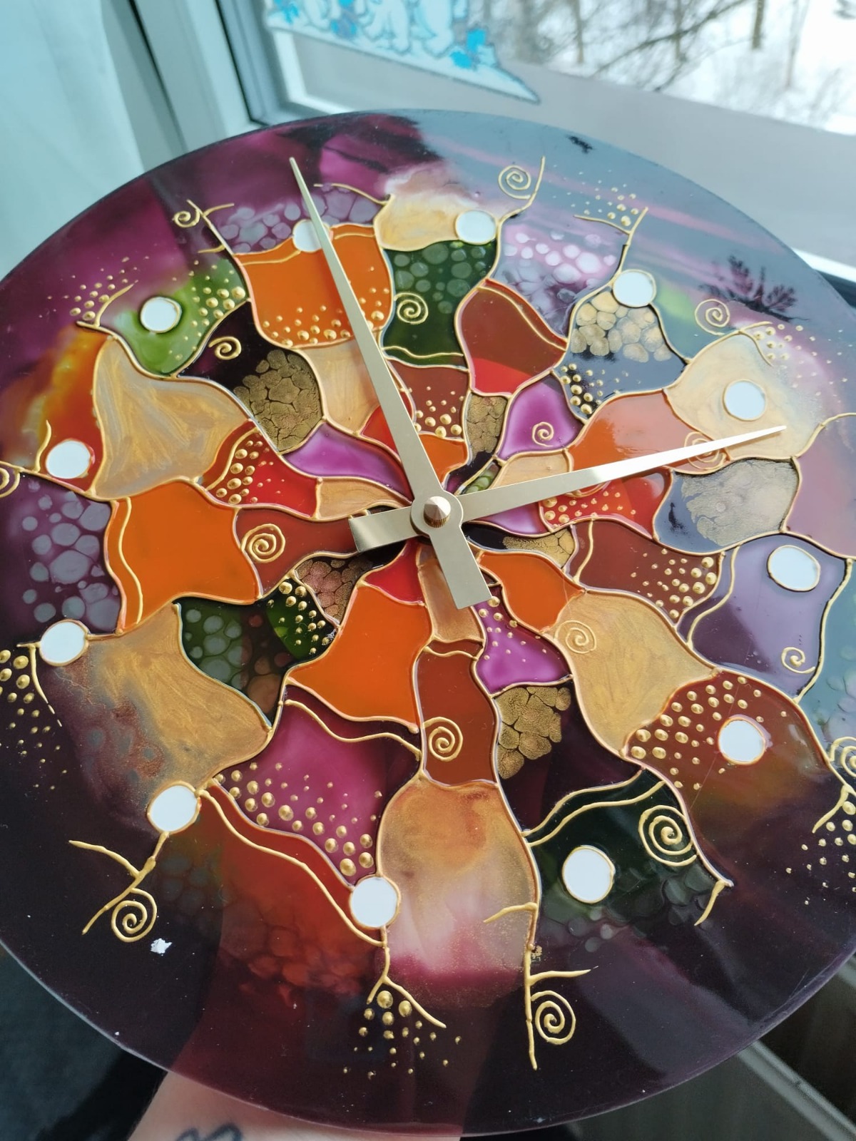 Nechte se okouzlit hrou barev a geometrie. Tyto ručně malované skleněné hodiny o průměru 25 cm připomínají rozkvetlou mandalu. Kombinace syté vínové, hřejivé oranžové a zlatých detailů dodá vašemu domovu pocit útulnosti a harmonie. Zlaté kontury a jemné tečkování vystupují nad povrch skla a vytvářejí tak fascinující 3D efekt.