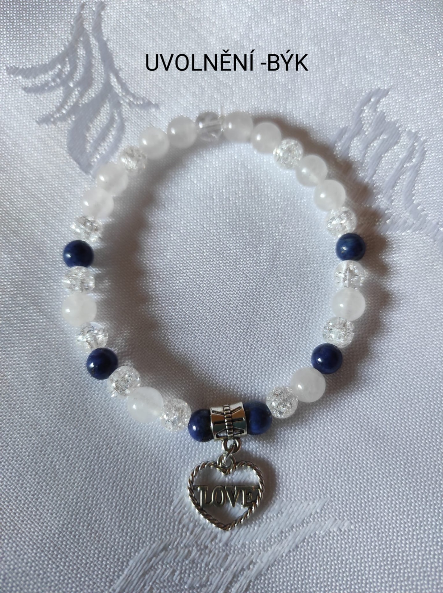 Materiál:Lapis lazuli, jadeit, křišťál-kulučjy 6mm, pružná gumička, přívěsek z nerezové oceli.