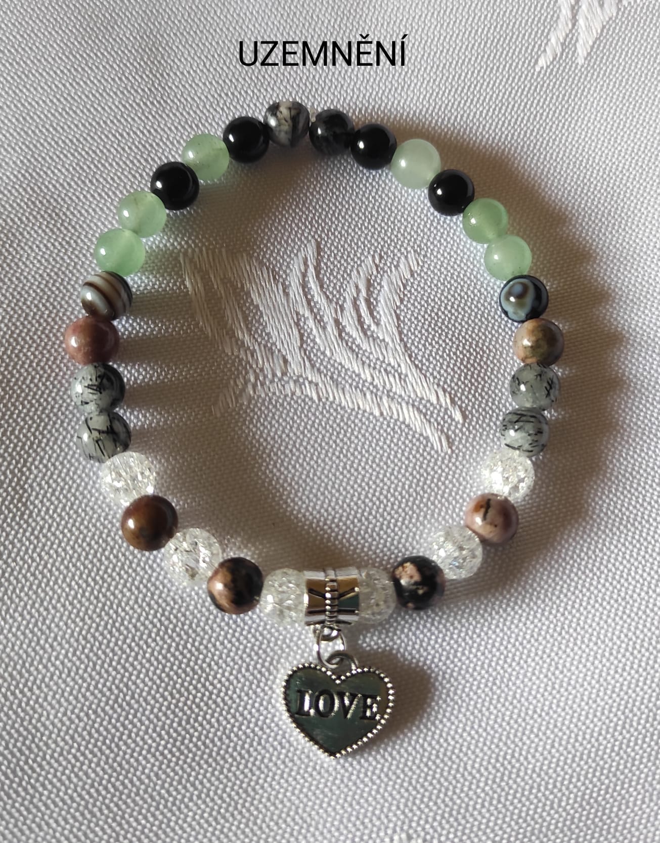 Materiál:Rodonit, obsidián vločkový, avanturín zelený,achát, křišťál-kuličky 6 mm,pružná gumička, přívěsek nerezová ocel.Spojení fyzično s duchovním.Spojení s přírodou ,tolerance, trpělivost.